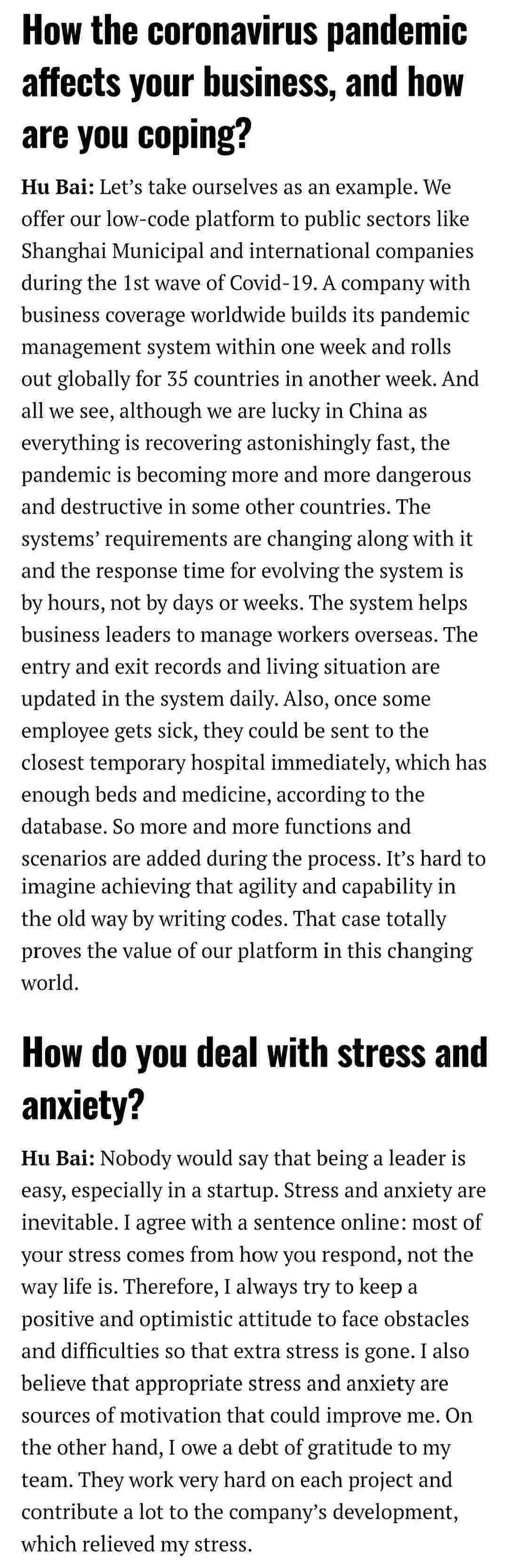 2021年年初,,,爱湃斯科技CEO胡柏受邀接受法媒Startup.info的专访,,与Startup info的读者分享了自己的创业经历、、以及低代码平台沃钱包的创新之处。。。